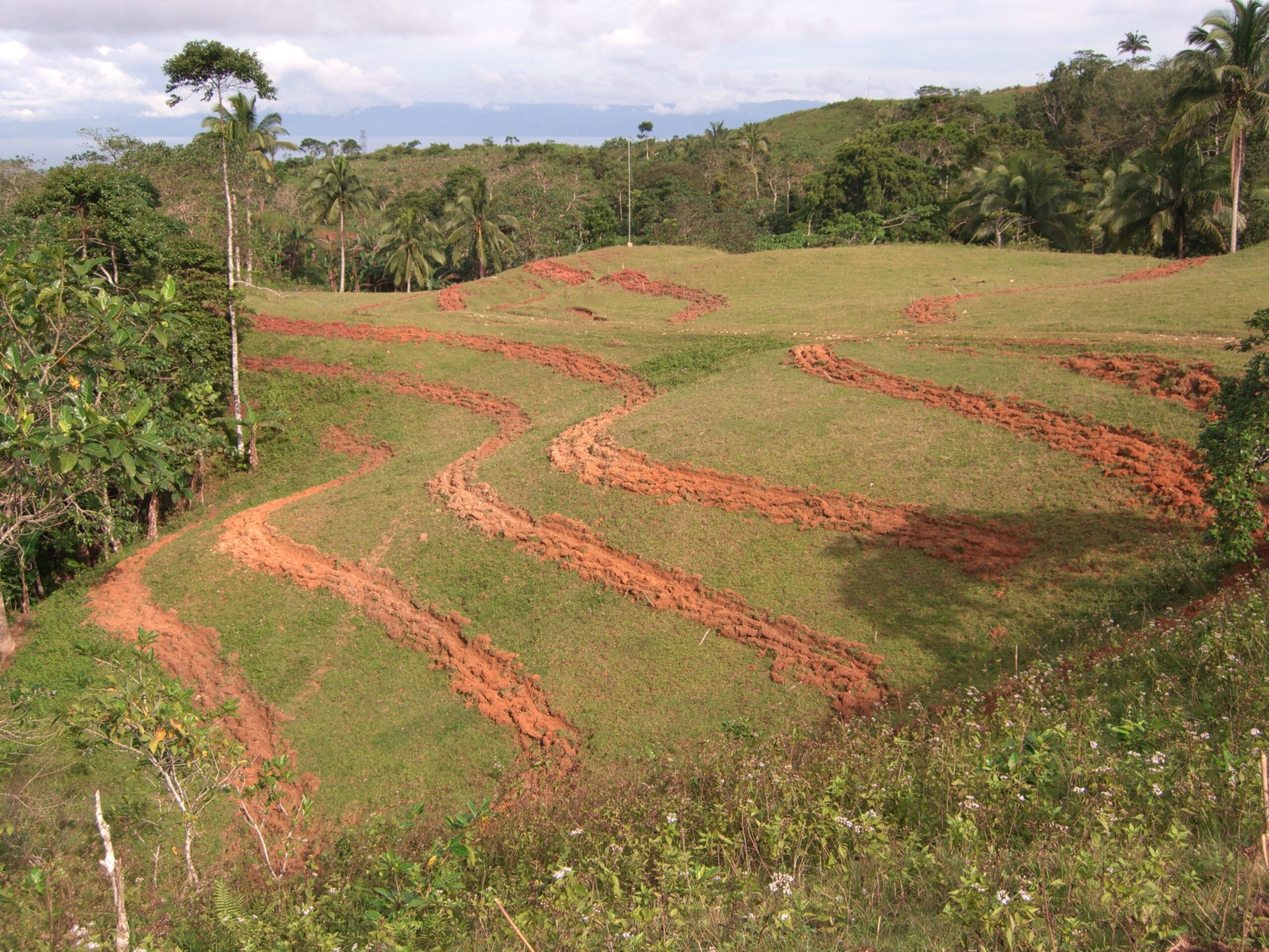 In den humiden Tropen regnet es oft heftig und anhaltend. Der Boden kann nicht die gesamte Wassermenge aufnehmen, was zu Oberflächenabfluss führt. Wenn dieser Abfluss an einem Hang stattfindet, spült das Wasser nährstoffreiche Erde weg. Dies macht den Boden unfruchtbar. Um das zu verhindern, kann man Hecken entlang der Konturlinien pflanzen. Sie werden parallel zur Geländeneigung, also in einer konstanten Höhe angelegt. Das ist eine effektive Methode, um Erosion an Hängen in den feuchten Tropen zu verhindern. Die bepflanzten Konturlinien bilden eine Art Barriere, die den Wasserfluss verlangsamt und das Wasser in den Boden sickern lässt, bevor es fortfließt.