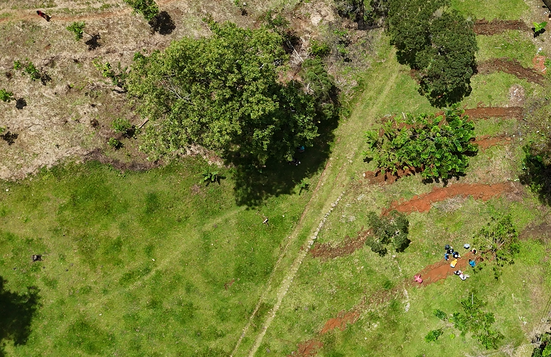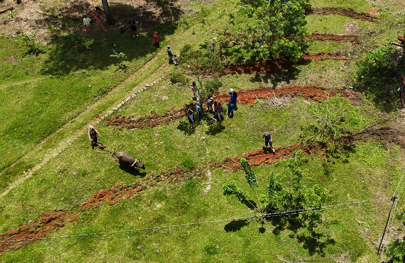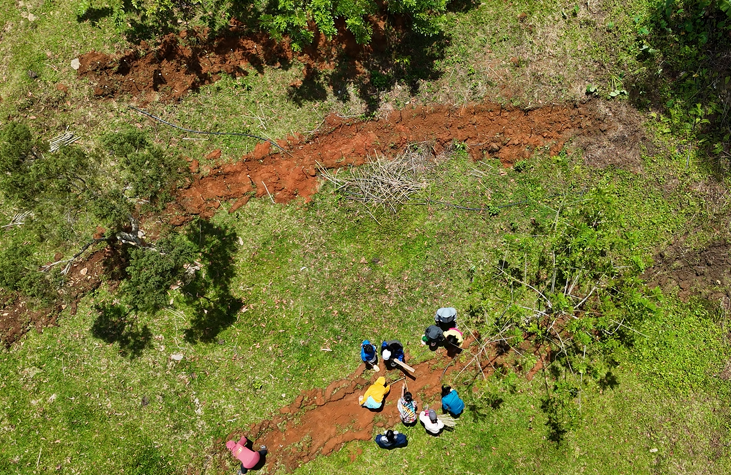 Entlang der Höhenlinien sind beim Pflügen mit dem Wasserbüffel rote Furchen entstanden. Wenn der Hang steil ist, sind die Furchen näher zusammen, wird er flach, haben sie einen größeren Abstand zueinander.