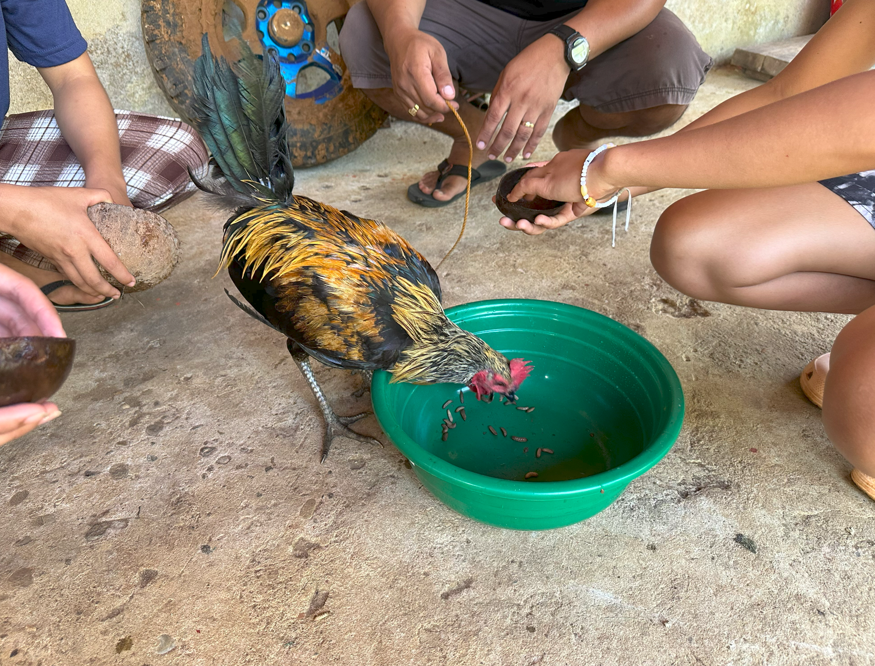 Wenn der Hahn die Larven gefressen hat, war das Projekt der Patenkinder erfolgreich abgeschlossen. Der Hahn hatte sich zur Freude der Kinder genüsslich über die Larven hergemacht.