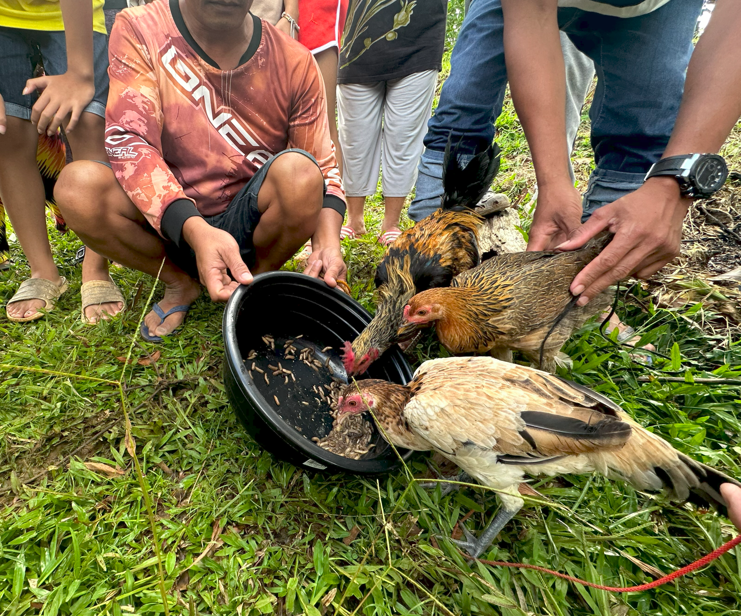 Wenn der Hahn die Larven gefressen hat, war das Projekt der Patenkinder erfolgreich abgeschlossen. Der Hahn hatte sich zur Freude der Kinder genüsslich über die Larven hergemacht.